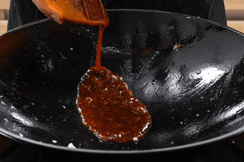 Влить на сковороду смесь соусов и довести до кипения.