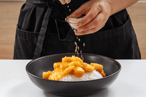Подавать креветки в соусе с рисом, посыпав жареным кунжутом.