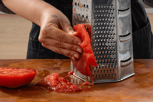Крупный помидор разрезать пополам и натереть на терке так, чтобы кожа осталась в руке. Или можно ошпарить, снять кожу и в таком виде натереть.
