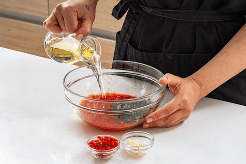 Отделить четверть получившегося маринада в отдельной емкости. Остальной маринад влить к мясу с перцем, закрыть пакет и помассировать, чтобы все перемешалось. Оставить мясо мариноваться на 12 часов в холодильнике.