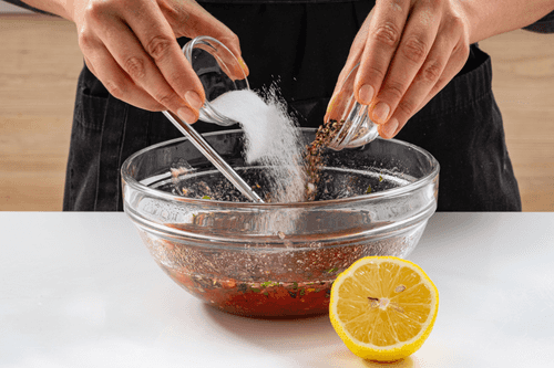 Выжать туда же лимонный сок, добавить дробленую смесь перцев и посолить.