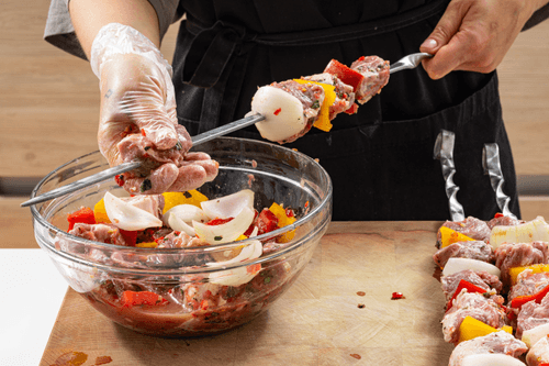Мясо нарезать кубиками, перец нарезать крупно, лук — на четвертинки. Сложить все в пакет.