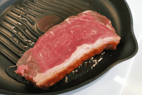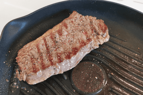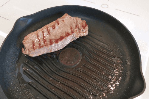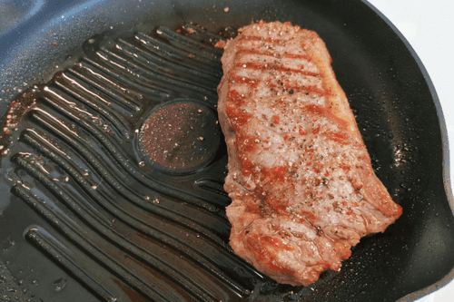 Сместить стейк, формируя узор «решетка». Обжаривать еще 2 минуты.