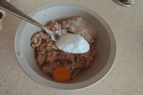 К фаршу добавить 1 куриное яйцо, 1 натертую головку лука. Посолить и поперчить по вкусу.