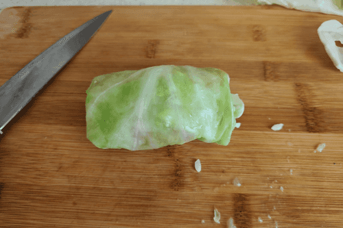 Для того чтобы листы капусты легко отделялись, кочан необходимо опустить в кипящую воду. Для удобства нож воткнуть в середину кочана.