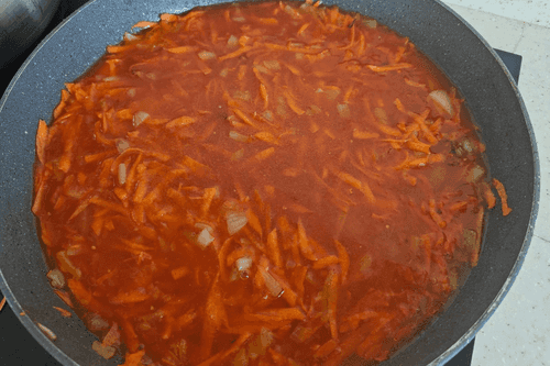 Добавить к луку морковь, обжарить до золотистого цвета. Затем влить воду и ложку томатной пасты.