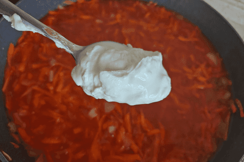 Добавить сметану и все перемешать. По желанию можно посолить и поперчить.