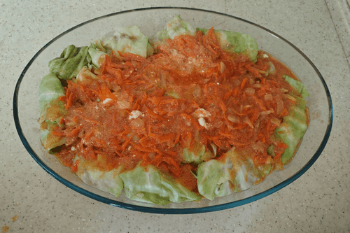 Готовой зажаркой полить сверху голубцы и убрать в разогретую до 200 градусов духовку. Запекать 40 минут.