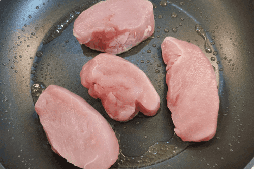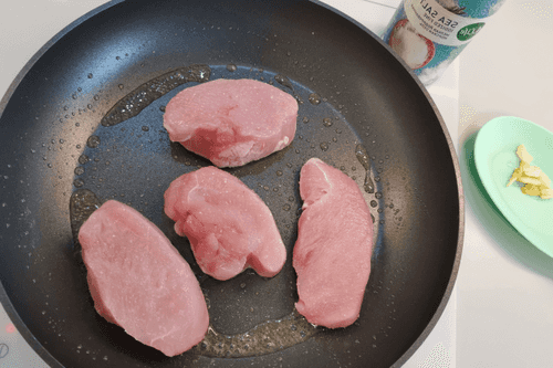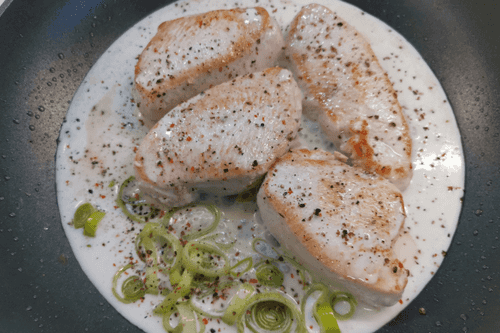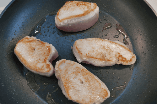 Разогреть на сковороде масло с чесноком. Как только чеснок подрумянится с обеих сторон, удалить. Нарезанное медальонами филе выложить на сковороду. Обжаривать 3 минуты.