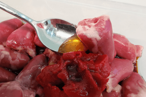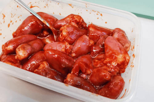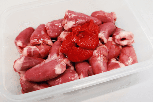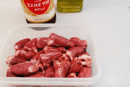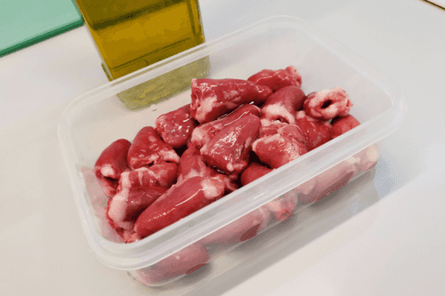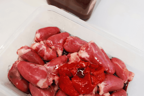 Обрезать на сердечках жир и лишние сосуды. Положить в лоток для маринования.