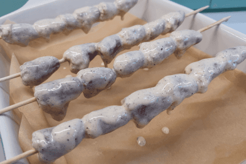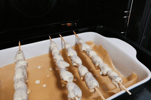 Форму для запекания застелить пекарской бумагой. Нанизать сердечки на шпажки и разместить на форме.
