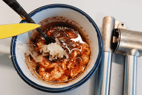 Выдавить чеснок при помощи пресса.