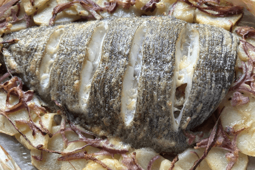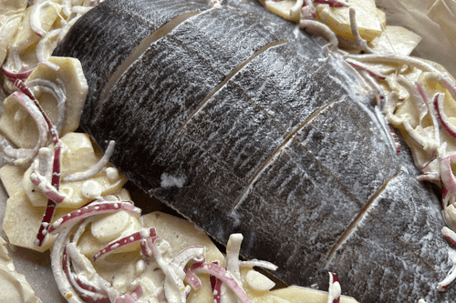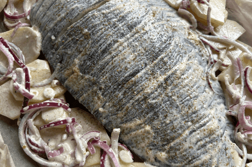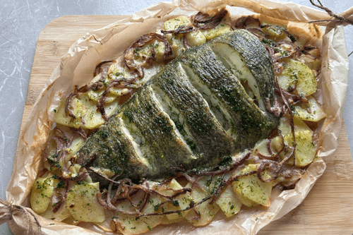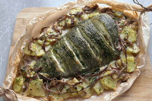 Выложить рыбу на пергамент, вокруг разложить картофель с луком.