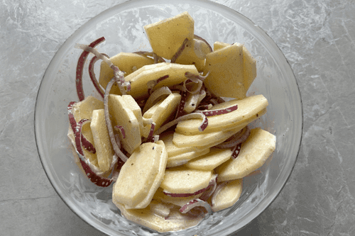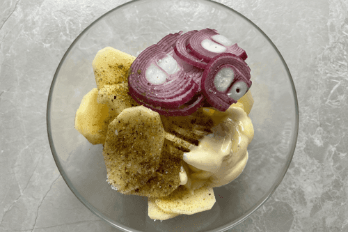 В миску отправить картофель, лук, майонез (2 ст.л.), соль, перец, хмели-сунели.