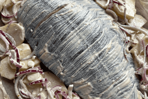 Палтус в духовке — это истинное воплощение кулинарного комфорта, восходящее к традициям русской кухни. Этот благородный белый океанский хищник приобретает нежную, сочную текстуру под тонкой золотистой корочкой, пропитанной ароматами хмели-сунели и черного перца. Гармоничное сочетание мягкого картофеля, сладковатого красного лука и пикантного майонеза придает блюду глубину вкуса, создавая идеальный баланс насыщенности и воздушной легкости. Запеченный в духовке палтус впитывает богатство специй, а завершающий штрих — укропный соус — добавляет свежую травянистую нотку, подчеркивая природную сладость рыбы. Это блюдо прекрасно подходит как для семейного ужина, так и для торжественного застолья, наполняя дом уютом и радостью.