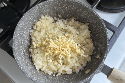 Добавить чеснок к луку и обжарить до золотистого цвета.
