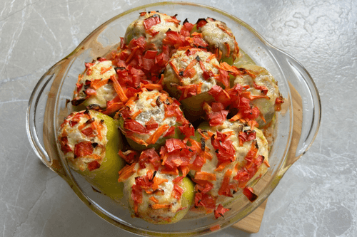 Фаршированные перцы — настоящее украшение русского стола, символ домашнего уюта и щедрости традиционной кухни. История этого блюда берет начало в глубокой старине, когда хозяйки заполняли овощи мясной начинкой, создавая питательное и ароматное угощение для всей семьи. Сладкий перец, пропитанный соками сочного фарша, нежного бекона и пряных специй, раскрывается мягкой текстурой с легкой остротой паприки. А морковь и помидоры, запеченные до золотистой корочки, добавляют свежую сладость и тонкую кислинку. Это блюдо универсально: его можно подавать как основное угощение на ужин или на праздничный стол. Вкус фаршированных перцев гармоничен и многогранен — он сочетает насыщенность мяса, нежность риса и свежесть овощей, превращая каждый кусочек в гастрономическое наслаждение.