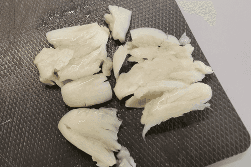 Мясо нарезать слайсами толщиной около 2 см.