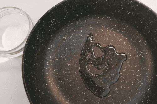 На сковороде разогреть оливковое масло и добавить щепотку крупной соли.