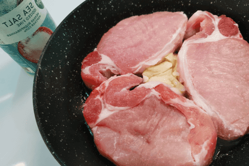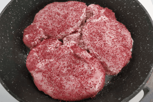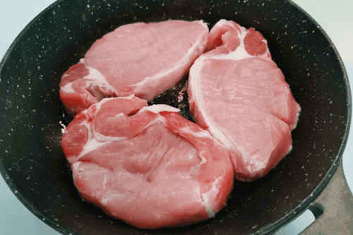 Выложить свинину на сковороду. Установить сильный огонь.
