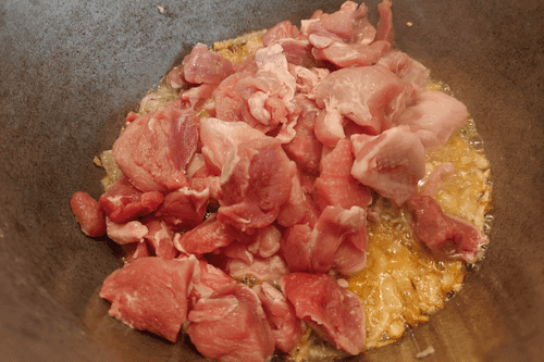 Свинину нарезать на небольшие кусочки.