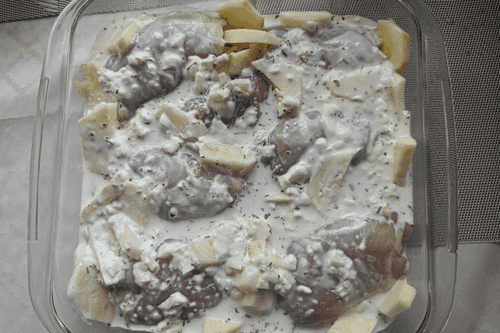Залить сливочной смесью и поставить в разогретую до 200 градусов духовку на 40 минут до готовности.