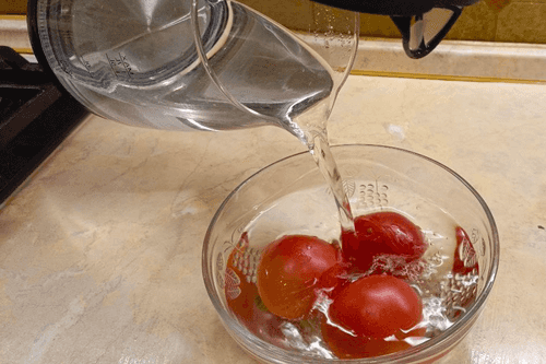 Кожицу у помидоров надрезать сверху, положить в емкость, залить кипятком на 1–2 минуты, затем под струей холодной воды очистить от кожицы