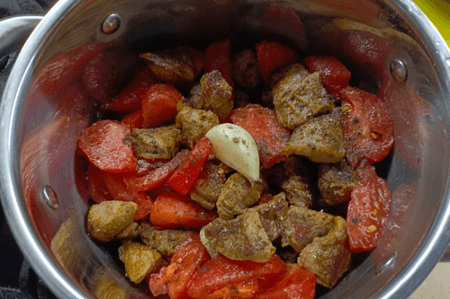 Мясо с помидорами посолить, поперчить, добавить вино, 1 мелконарезанный зубчик чеснока, положить душистый перец.