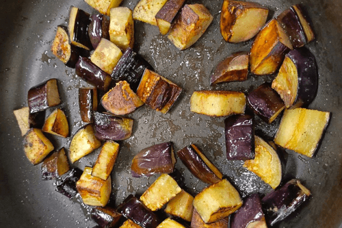 Баклажаны помыть, обсушить, нарезать средними кубиками (не мельчить!), обжарить на оставшемся масле, сложить в миску, посолить, поперчить.