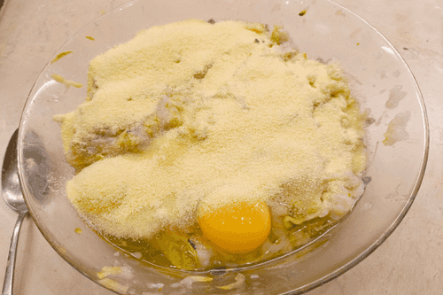 Добавить в фарш хорошо отжатый кабачок, яйцо, манную крупу, перемешать.
