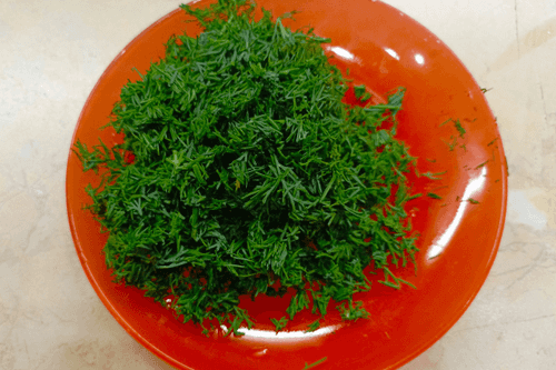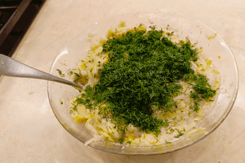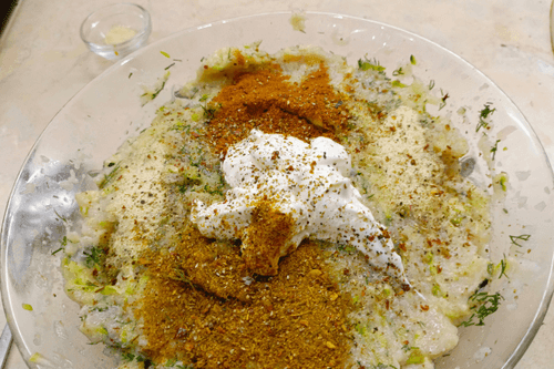 Добавить специи, сметану, посолить, поперчить, накрыть пленкой, оставить на 30 минут для набухания манки.
