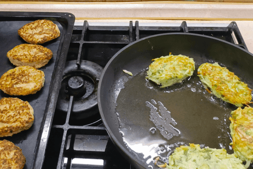 Противень застелить пергаментом или положить коврик, включить духовку разогреваться до 200 градусов, поставить сковороду на огонь выше среднего, добавить растительное масло. Влажными руками формировать из фарша котлеты, обжаривать их до румяности с двух сторон и перекладывать на противень.
