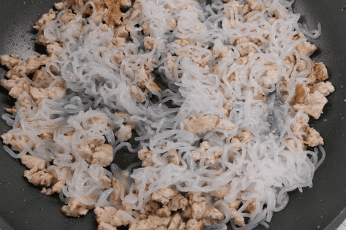 Выложить ширатаки к курице. Через минуту убавить огонь до среднего.