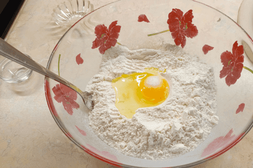 Приготовить тесто для вареников. Просеять в миску 3 стакана муки (250 мл). Добавить 1/2 чайной ложки соли, перемешать. Яйцо взбить вилкой, добавить в муку, перемешать.