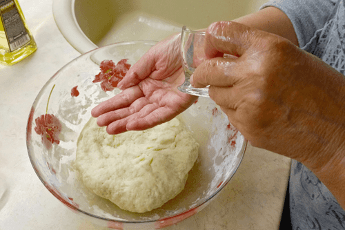 Влить в муку 200 мл крутого кипятка, добавить 2 столовых ложки растительного масла и замесить тесто. Смазать руки растительным маслом (1 столовая ложка), собрать тесто в шар.