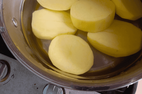 Пока тесто отдыхает, приготовить начинку для вареников. Картофель вымыть, очистить, разрезать пополам, залить горячей водой, посолить. Варить до готовности на среднем огне.
