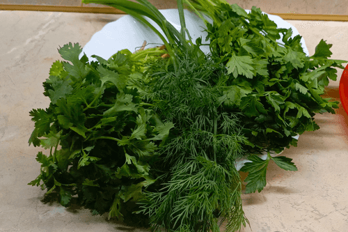 Укроп, петрушку, кинзу промыть, удалить грубые веточки, зелень мелко нарезать.
