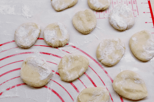 Оставшуюся часть раскатать в жгут, нарезать на кусочки, раскатать лепешки.