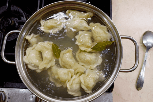 Отваривать вареники, опуская их по одному в кипящую подсоленную воду, в которую добавить 1 столовую ложку растительного масла и 2 лавровых листа. Аккуратно перемешивать обратной стороной столовой ложки, чтобы не повредить. Когда вареники сварятся, они всплывут. После этого их варят еще 3–4 минуты и вынуть шумовкой.