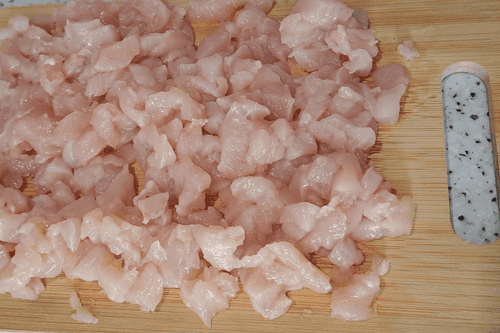 Филе куриной грудки хорошо помыть под проточной водой, убрать все лишнее, нарезать мелким кубиком. Чтобы легче было резать, можно филе немного подморозить.