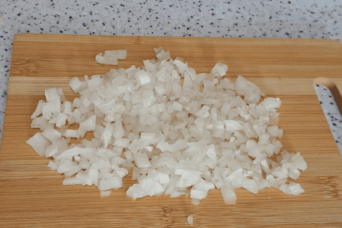 Лук очистить, хорошо вымыть, нарезать мелким кубиком и выложить к нарезанному филе.