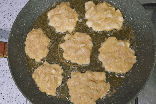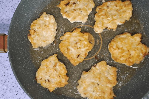 Подготовленную смесь, перед тем как жарить, необходимо еще раз хорошо перемешать столовой ложкой. Когда масло в сковороде разогреется, выложить смесь столовой ложкой, придавая форму. Накрыть крышкой и жарить на медленном огне.