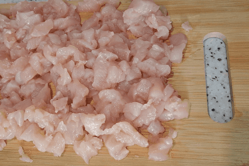 Филе куриной грудки хорошо помыть под проточной водой, убрать все лишнее, нарезать мелким кубиком.