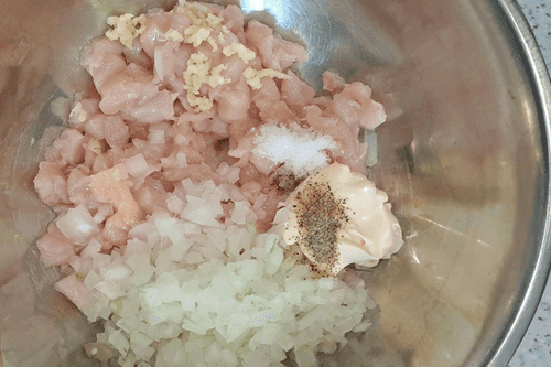Очистить и хорошо вымыть чеснок, выдавить его через пресс. Добавить к нарезанному мясу и луку чеснок, 1 столовую ложку майонеза, соль и перец по вкусу.