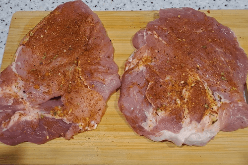 Каждый порционный кусок мяса с обеих сторон хорошо смазать приправами.