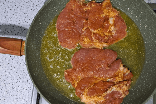 Когда масло на сковороде нагрелось, выложить промаринованное мясо на сковороду и жарить на среднем огне, не накрывая крышкой, до румяной корочки.