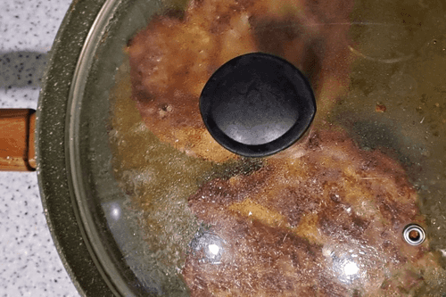 Мясо на сковороде перевернуть на другую сторону. Жарить примерно 2–3 минуты под открытой крышкой.