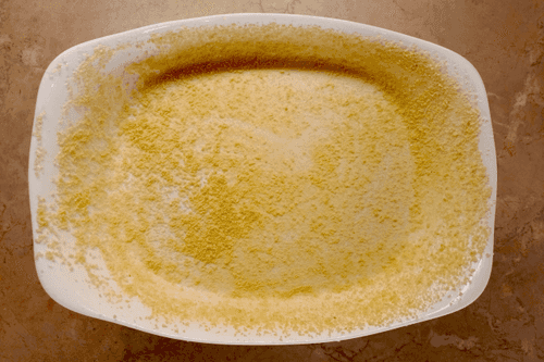 Форму для запеканки смазать 1 чайной ложкой сливочного масла и посыпать панировочными сухарями.