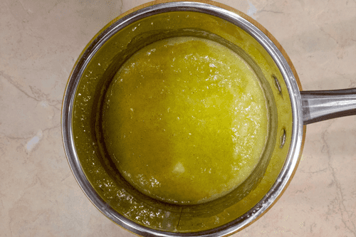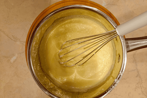 Остальное масло положить в ковшик с толстым дном, разогреть, просеять в него муку, хорошо размешать.