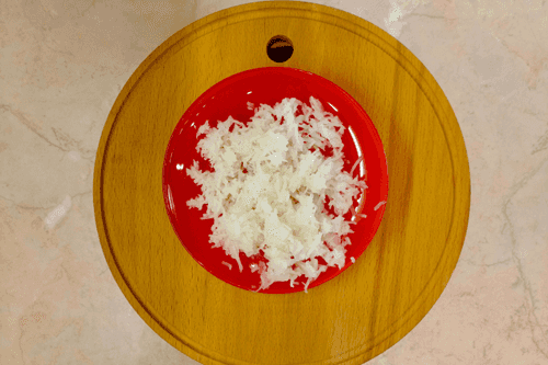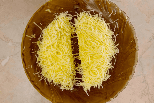 Сыр натереть на мелкой терке и разделить на 2 части.